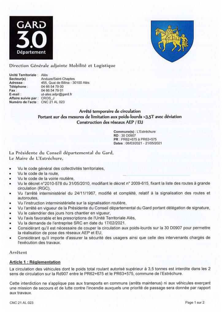 La circulation des véhicules dont le poids total roulant autorisé est supérieur à 3,5 tonnes sera interdite dans les deux sens de circulation sur la commune de l’Estréchure,