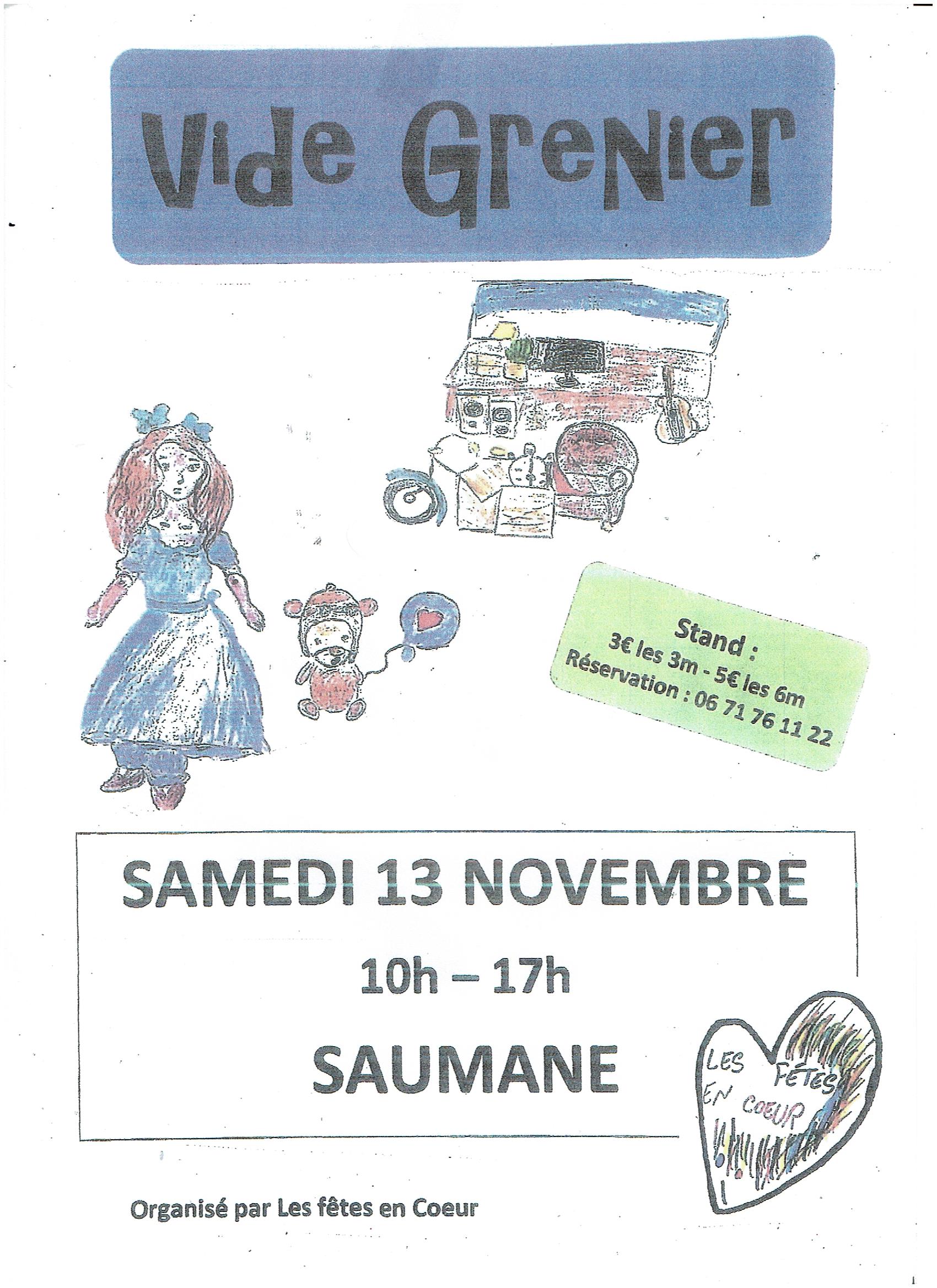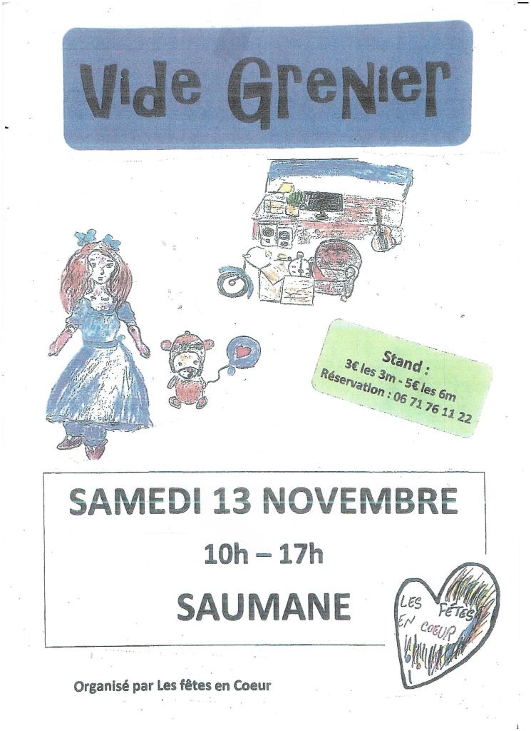 Le 13 /11/2021 : vide grenier organisé par l’association « les fêtes en coeur » de 10h à 17h, réservations au 06.71.76.11.22
