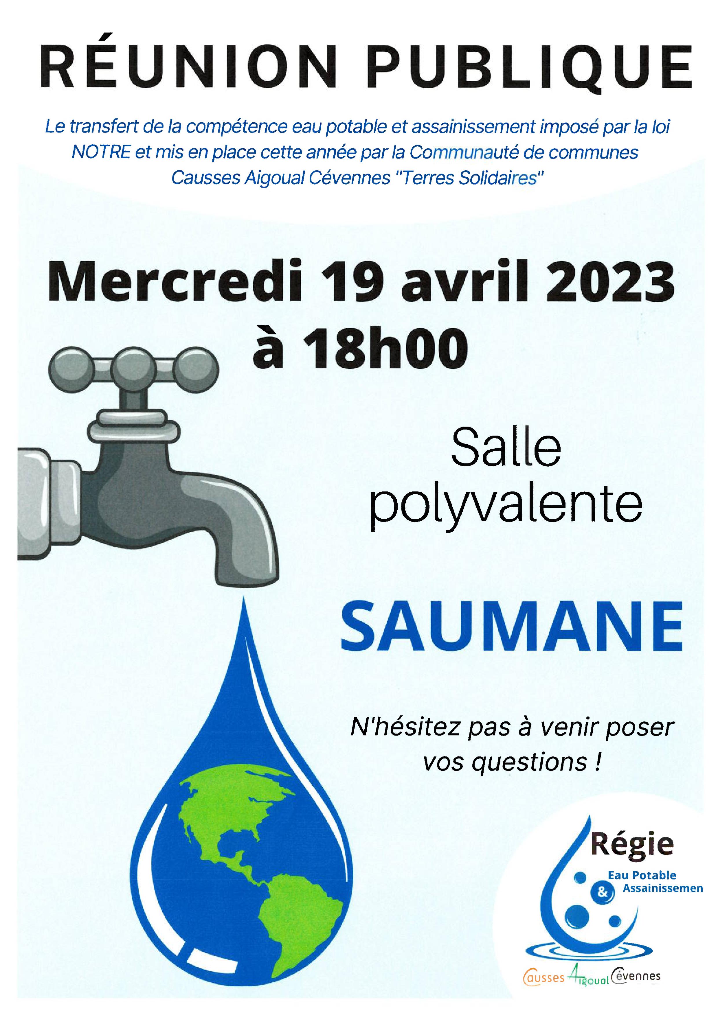Suite au transfert de la compétence eau potable et assainissement à la Communauté de communes Causses Aigoual Cévennes, la régie eau potable et assainissement vous rencontrent pour échanger sur ce sujet.