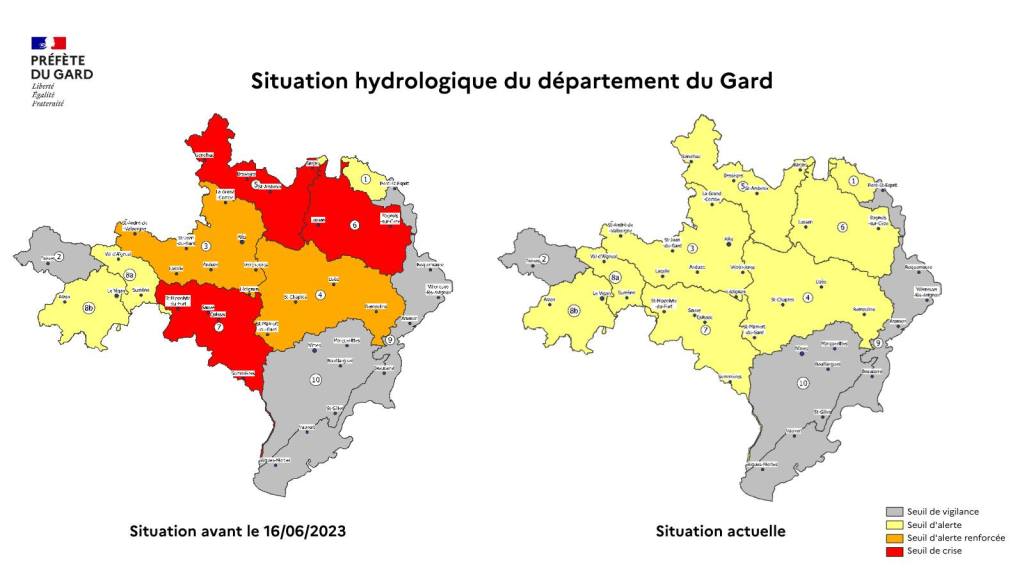 A l’issue de cette concertation, madame la préfète a décidé d’abaisser les contraintes de tous les secteurs qui avaient été maintenus en alerte renforcée ou en crise. Ainsi, la Cèze, les Gardons et le Vidourle passent désormais au niveau de l’alerte, comme l’Hérault, l’Arre et l’Ardèche déjà à ce niveau : ces bassins ne peuvent cependant pas descendre au niveau de vigilance, en raison de la faiblesse de recharge des nappes, qui restent globalement basses par rapport à la normale. Le reste du département est maintenu en vigilance.