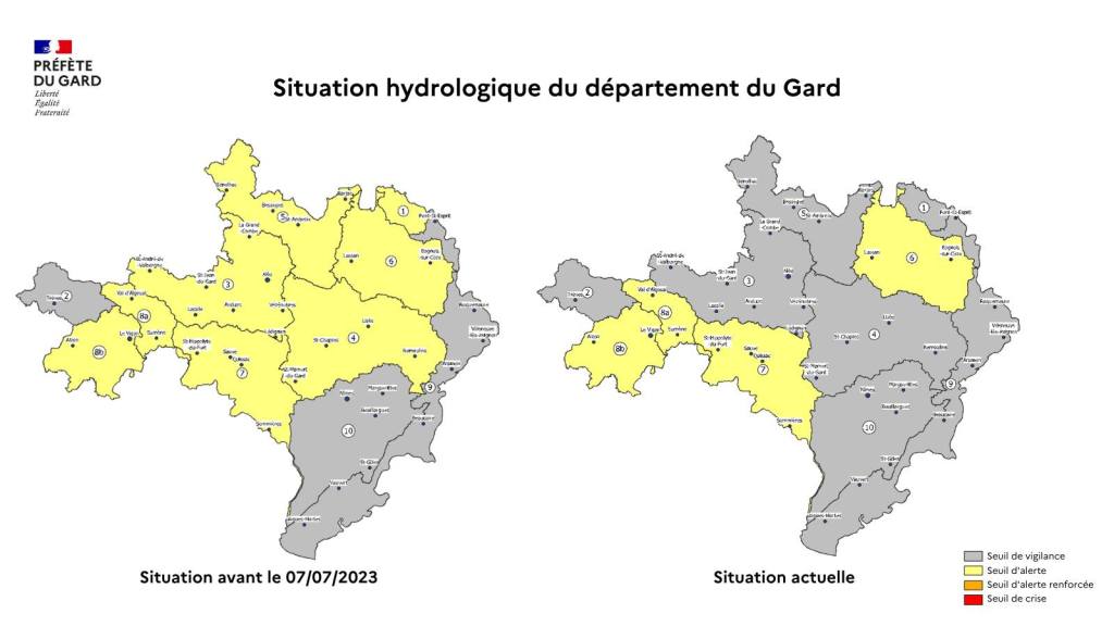 À l’issue de ce travail de concertation, Marie-Françoise Lecaillon, préfète du Gard, a décidé d’𝗮𝗹𝗹𝗲́𝗴𝗲𝗿 𝗹𝗲𝘀 𝗰𝗼𝗻𝘁𝗿𝗮𝗶𝗻𝘁𝗲𝘀 sur les Gardons amont et aval ainsi que sur la Cèze amont et sur l’Ardèche. Ces 4 sous-bassins passent donc au seuil de vigilance. La Cèze aval, le Vidourle, l’Arre et l’Hérault restent en seuil d’alerte.